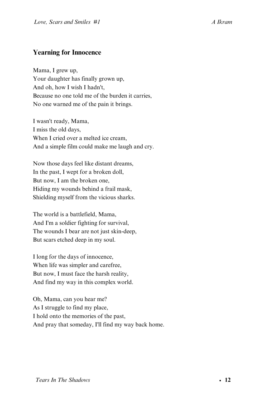 In this collection of heartfelt poems, A. Ikram unveils the unspoken struggles that reside in the depths of grief, heartbreak, and generational trauma. Through raw and poignant verses, Tears In The Shadows explores themes of resilience, longing, vulnerability, and the silent battles we fight daily. Each poem serves as a reflection of survival, of finding light despite the weight of sorrow, and of embracing love and kindness even in the face of adversity.