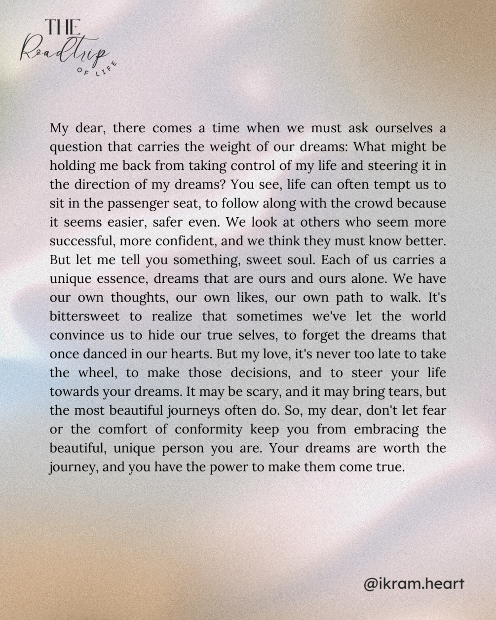 "The Roadtrip of Life" is a poetic journey that takes you through the ups and downs of life. It is a book that mirrors the author's own journey but is uniquely yours too. The author shares their personal story, the hurdles, the triumphs, and the countless moments of growth. They become your companion, a friend who cheers you on from the sidelines. The book is dedicated to all those who have lingered in the backseat of their lives, hesitant to take the wheel. It's time to cast away those doubts and fears and learn how to drive towards the life you've always dreamed of. The road might be winding, and at times, it might feel like you're steering through a storm, but the view from the driver's seat is beyond breathtaking. This book will transform not just the way you see the world, but the way you see yourself. Get ready to take the wheel and embrace the adventure that lies ahead.